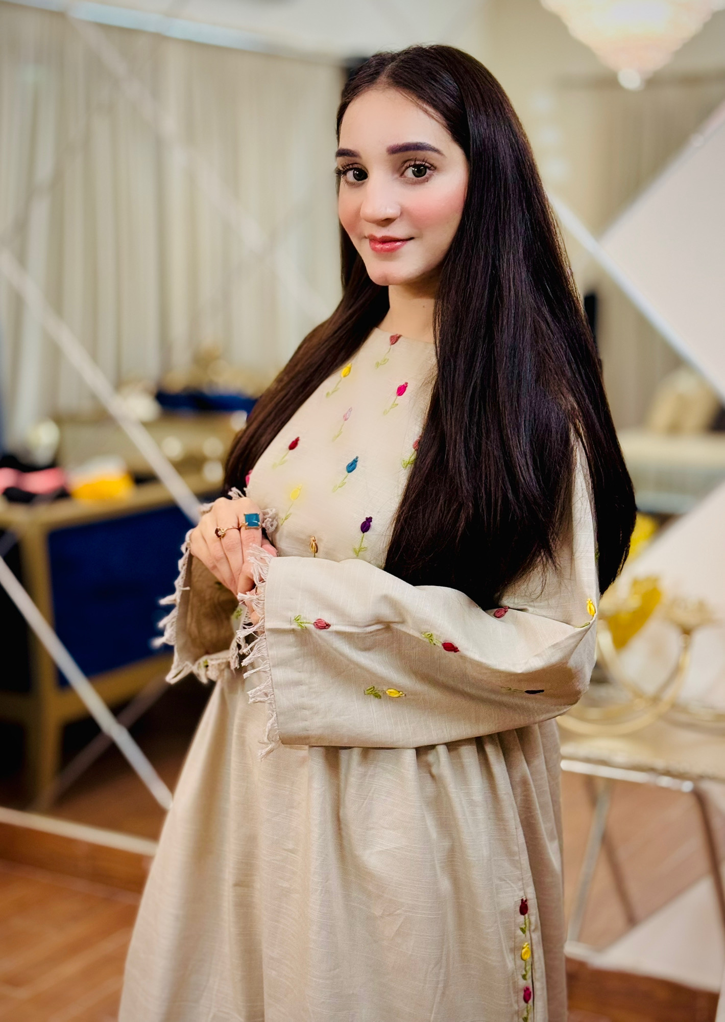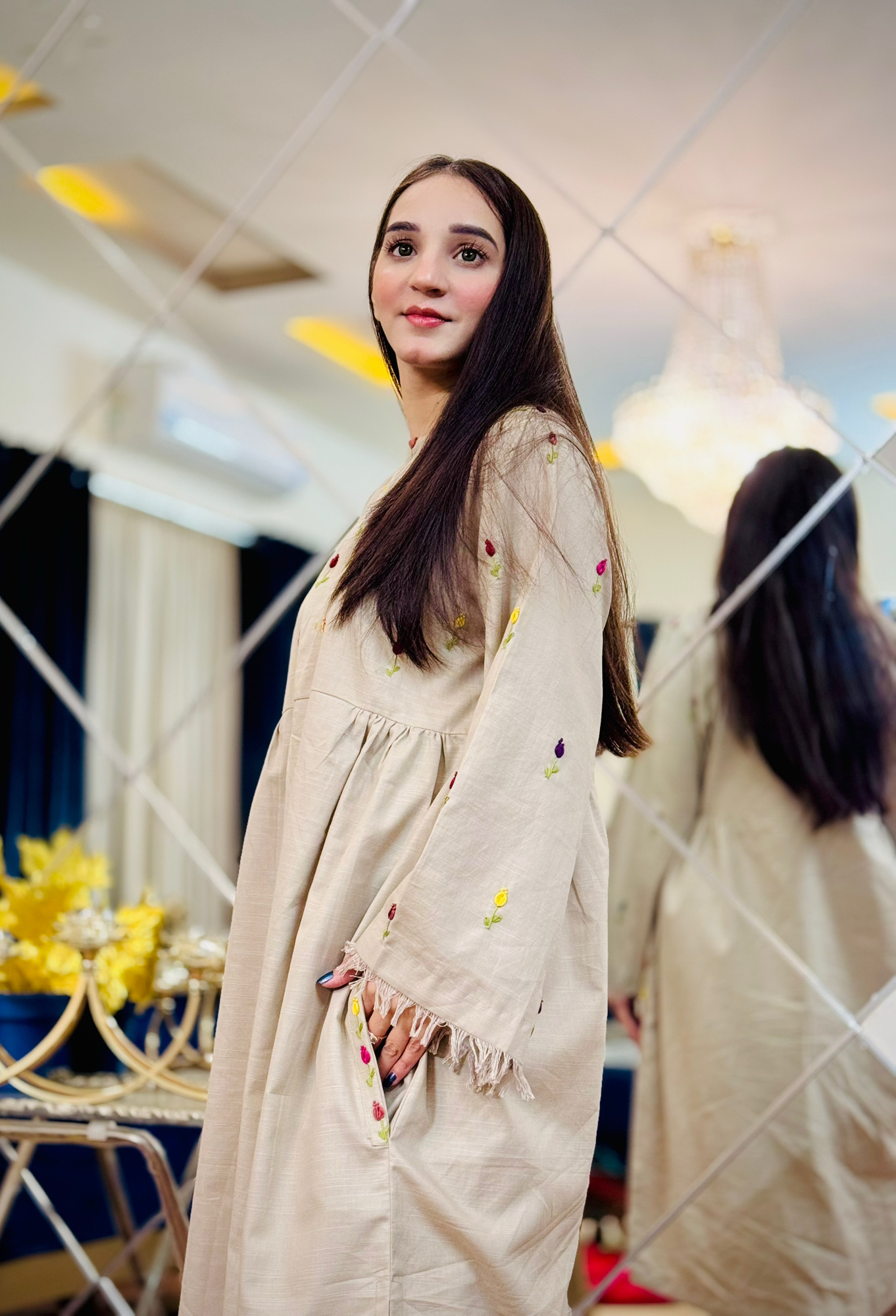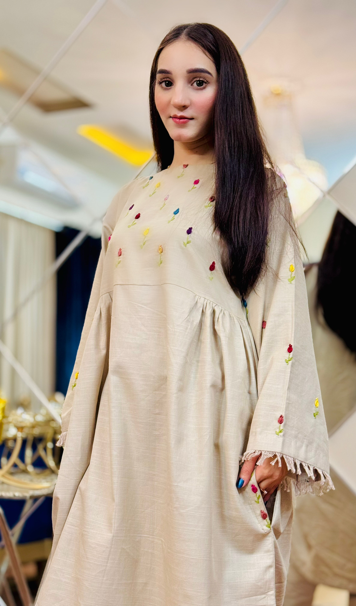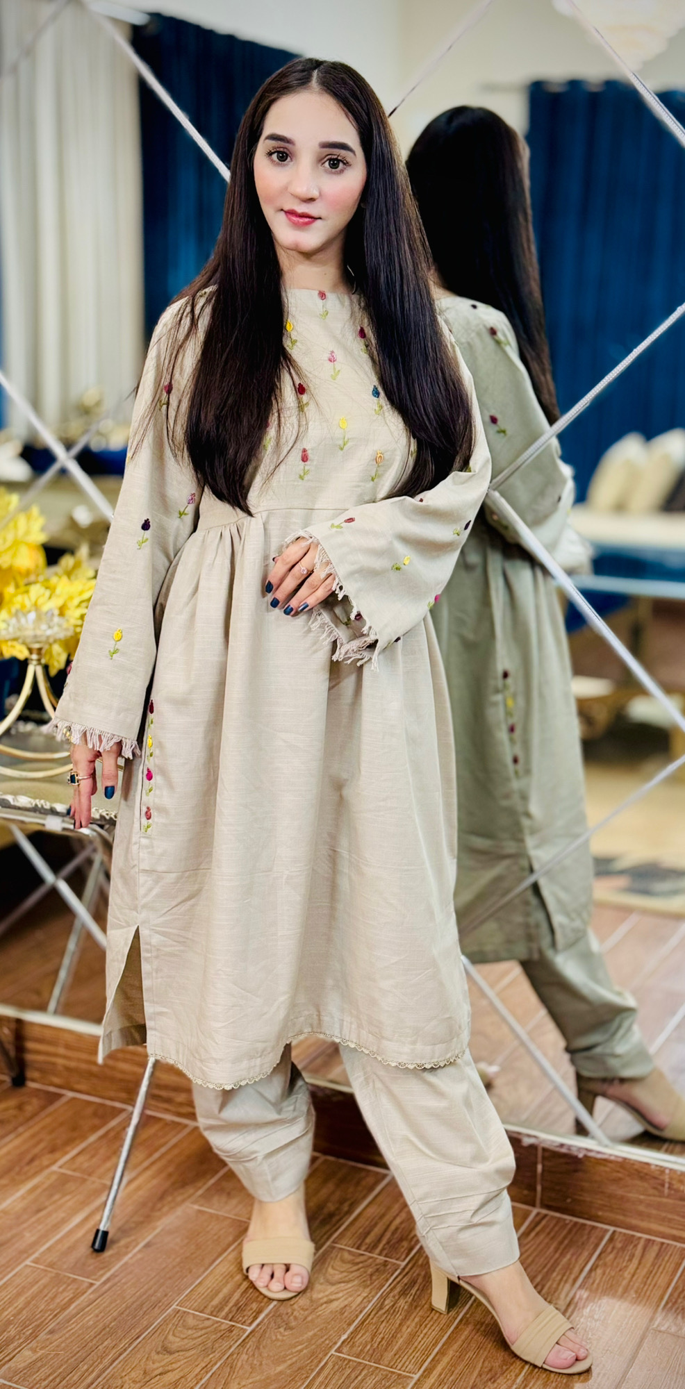 Step into effortless elegance with this beautifully designed beige A-line frock paired with straight pant trousers, made from premium quality pure khaddar fabric. Perfect for cooler seasons, the fabric offers warmth, durability, and all-day comfort.